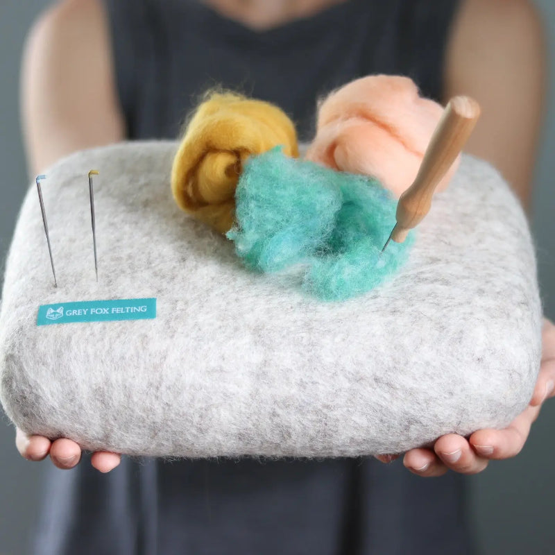 This 100% pure wool needle felting mat is made of solid wool which has been wet felted to give it great durability and the perfect amount of support when using it as a work surface for needle felted sculptures and wool paintings. It is solid enough support your work without it sinking into the pad, but has just the right amount of give to take repeated pokes of your felting needle without sacrificing the working surface of the block or causing needle breakage.