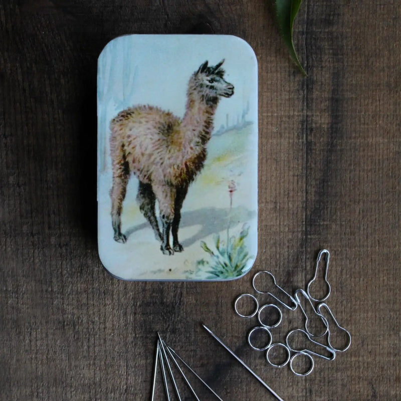 This adorable Llama Knit Kit contains an assortment of all of the essential notions to complete a project. This handy slider tin features a vintage llama print covered in hand-poured resin. This tin is the perfect compact size to stow in your knitting bag but is also large enough to store all of your small knitting and sewing notions! The best part is that the bottom of the tin is magnetic, so most items will stay put when you slide it open. Handmade in British Columbia by Firefly Notes.