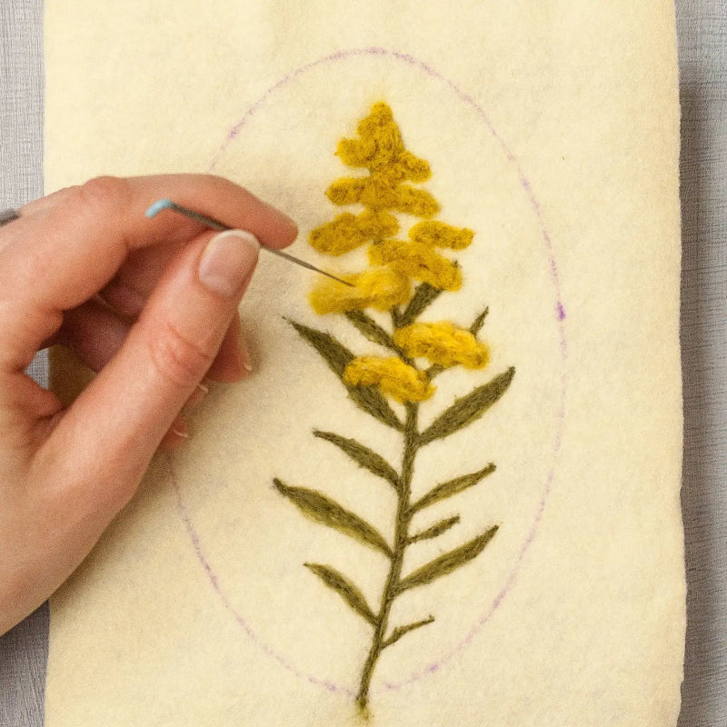 This kit provides the materials you need to make your own needle felted goldenrod wall hanging, including: