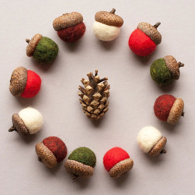 This Holiday Felted Acorn kit comes with everything you need to create your own set of holiday acorn, including: